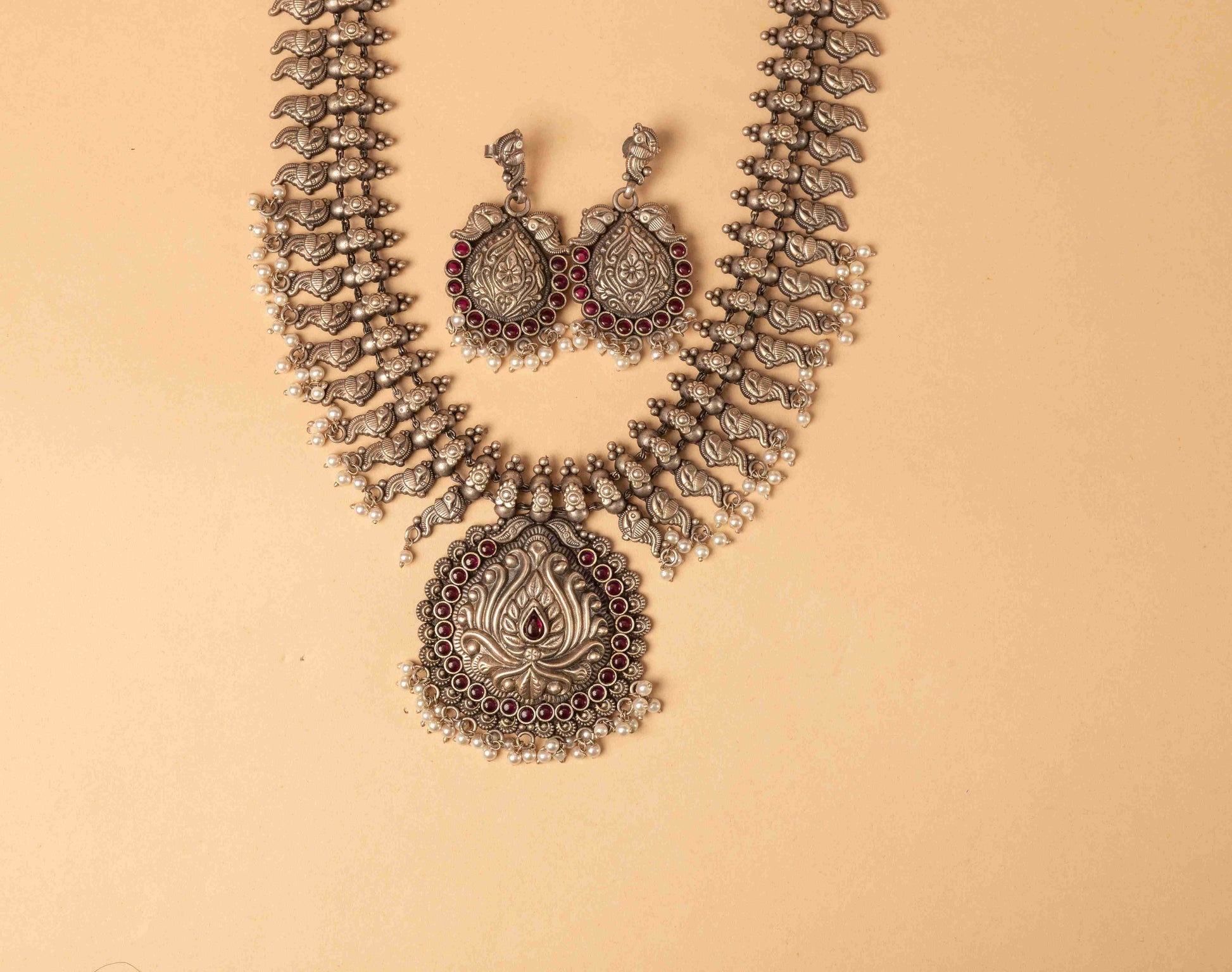 Designed with intricate detailing, this oxidized necklace set adds a vintage charm to traditional outfits.