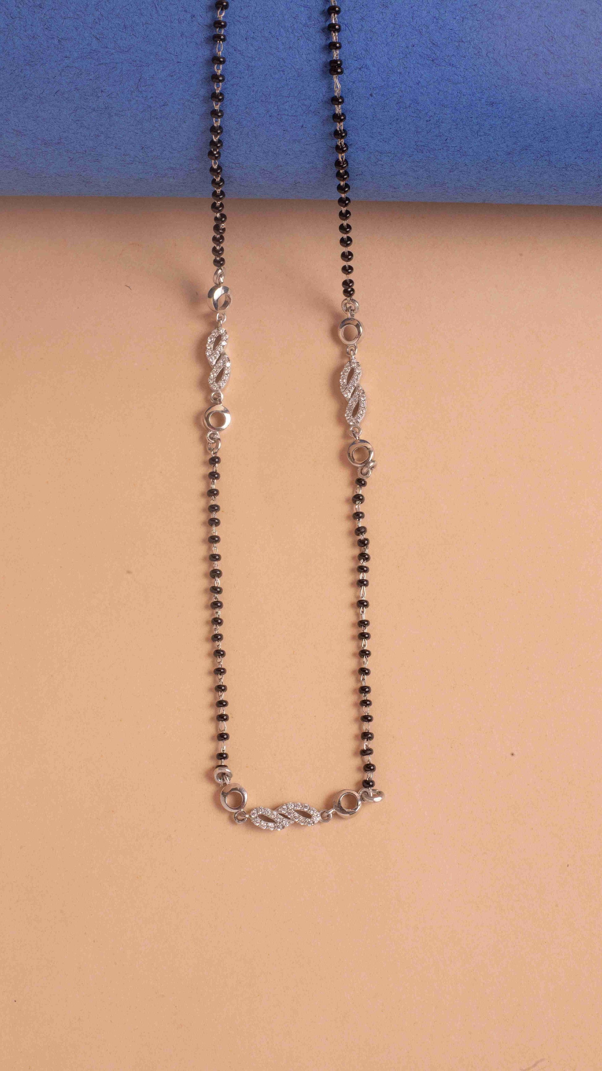 A timeless design in 92.5 sterling silver with traditional black beads and a sleek pendant, symbolizing love and elegance.